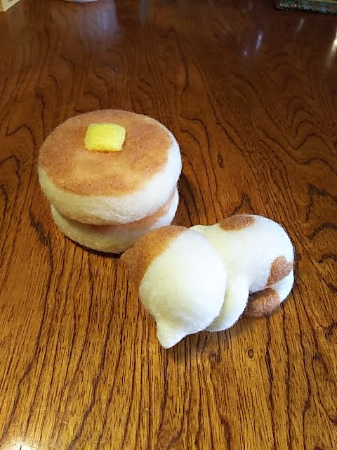ホットケーキまんツイを結構見かけて、そういえばねこあつめチクチクでホットケーキ作ったな~と思いだし🤗 そしてエリザベスまん思いだし🤣 #羊毛フェルト