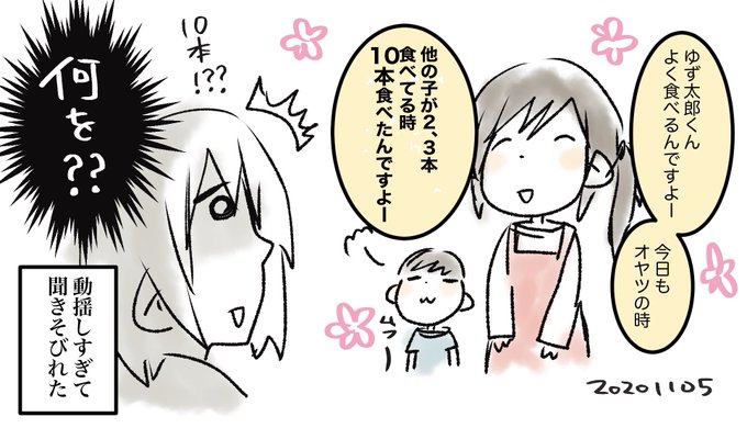 0 18 ゆず太郎1歳5ヶ月9日 最近保育園のお迎えの時に言われたこと😇 どんなスピードで食べてるの、君!/(^o^)\てか何を10本たべてたの!! #2019may_baby #育児絵日記 #育児漫画 #ゆず太郎日記 20/11/05 21:47