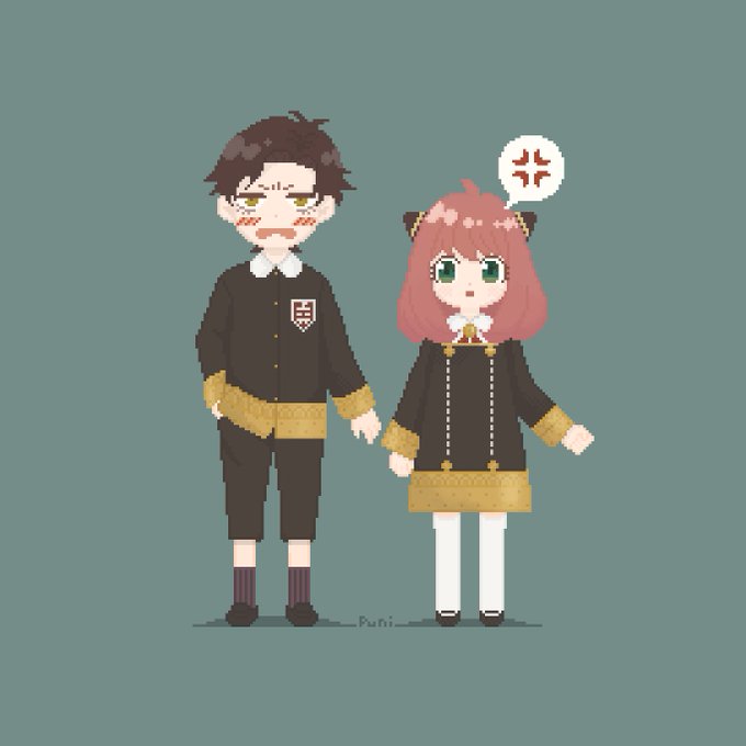 (このオレがこんなちんちくりんの庶民の女と手を繋ぎたいとか、違う、そういうのじゃない!!!!このオレ様がこんなブスで短足の…ブスブスブース!!!!) 「いまこそひっさつの…」 ダミアニャかわいい… #pixelart #ドット絵 #SPY_FAMILY