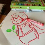 クレヨンでらくがき帳に絵を描いて、スタンプも貼った物。