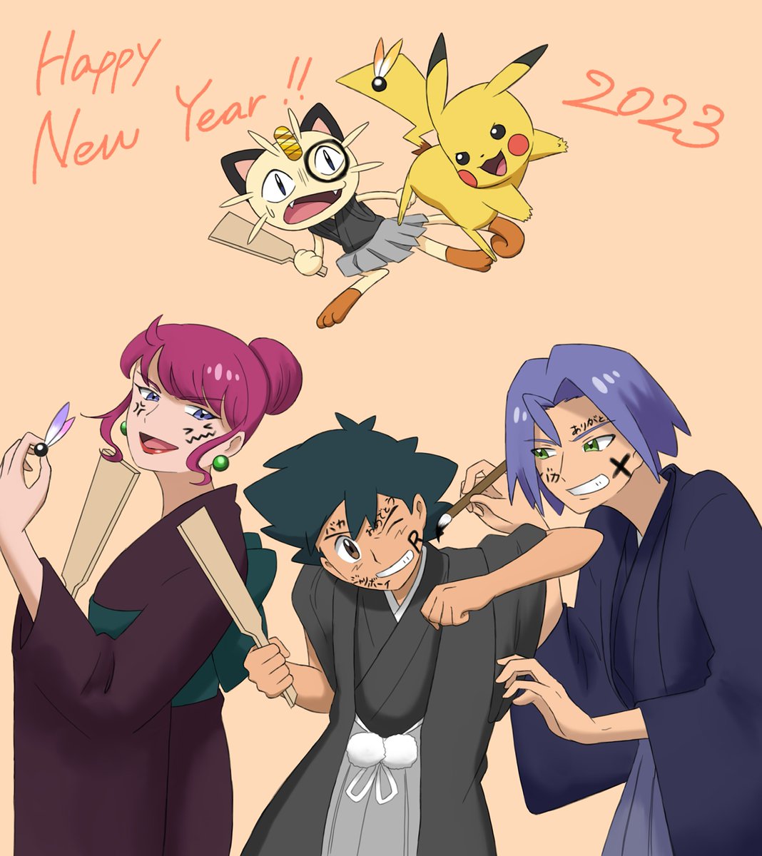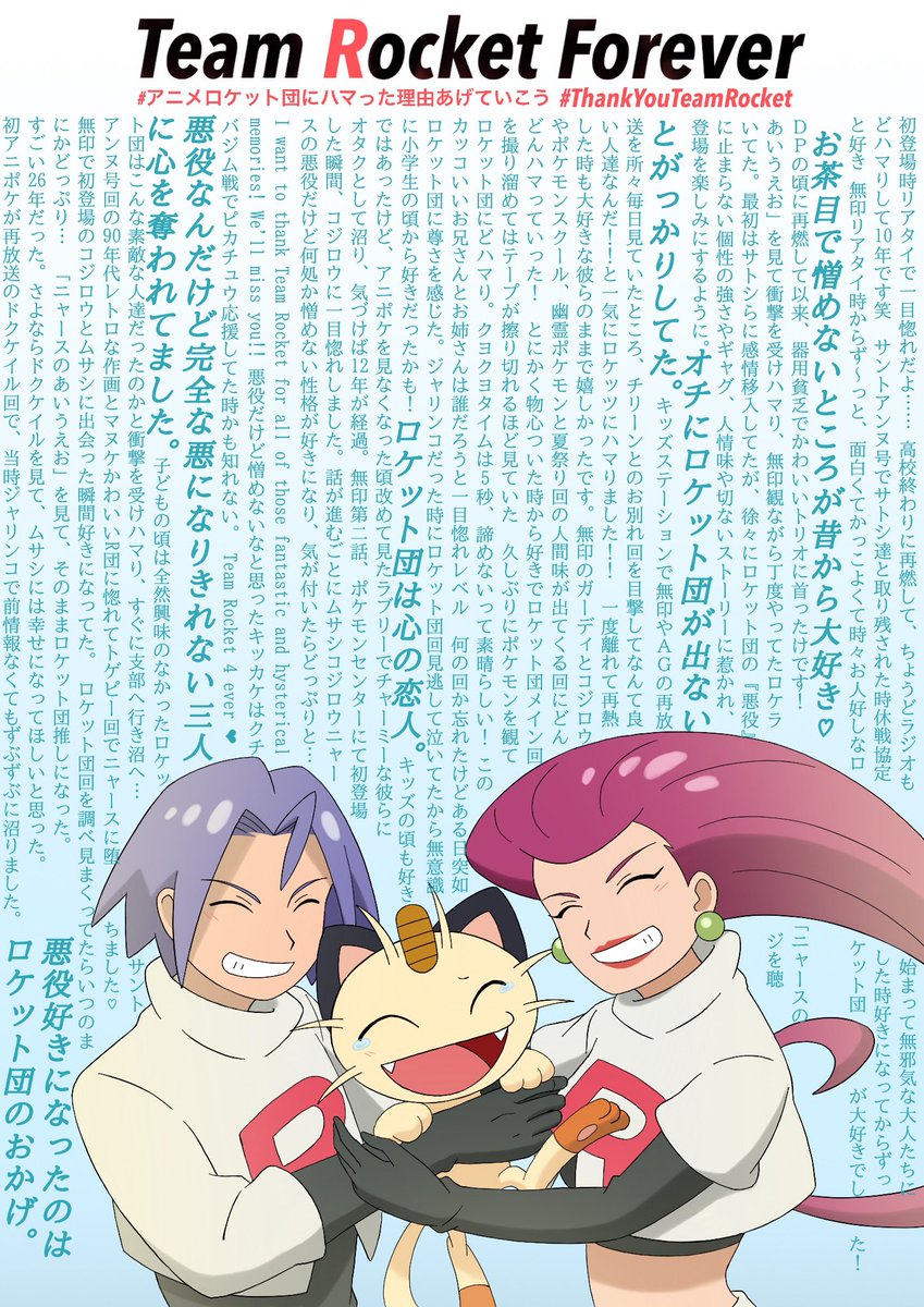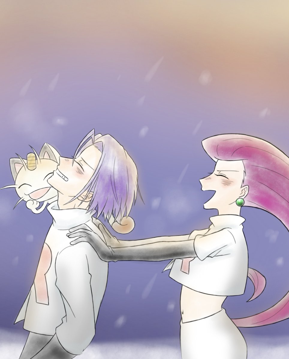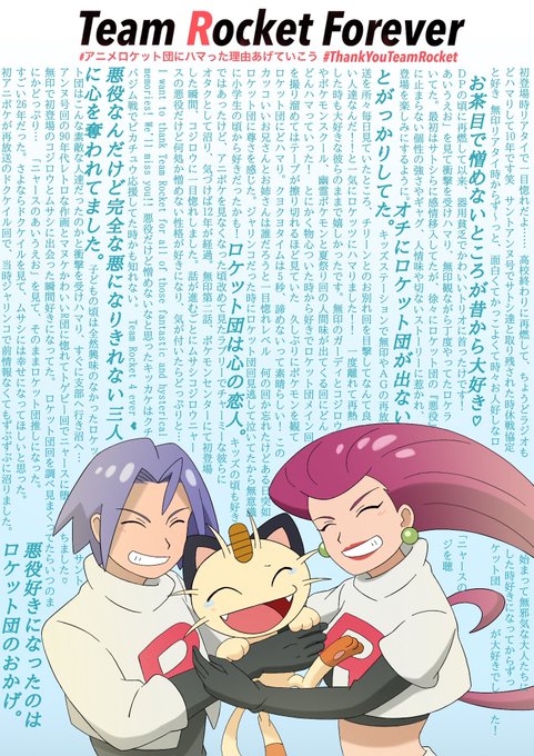 素敵なハッシュタグ #アニメロケット団にハマった理由あげていこう #ThankYouTeamRocket より… ご勝手ながら皆様の素敵なお話を元に、ありがとう絵ではありませんがR団と、R団が大好きな皆様に会えたことの記念に描かせて頂きました……! ラブリーチャーミーな3人に この声が届きますように……🚀🌹