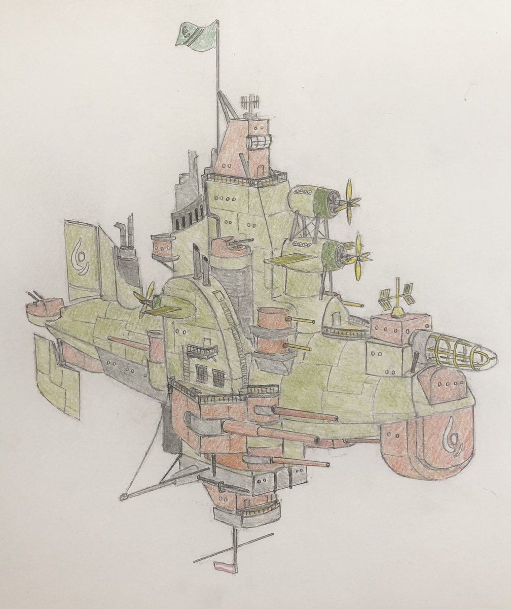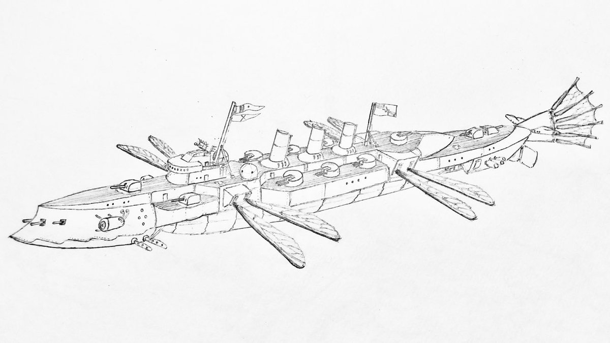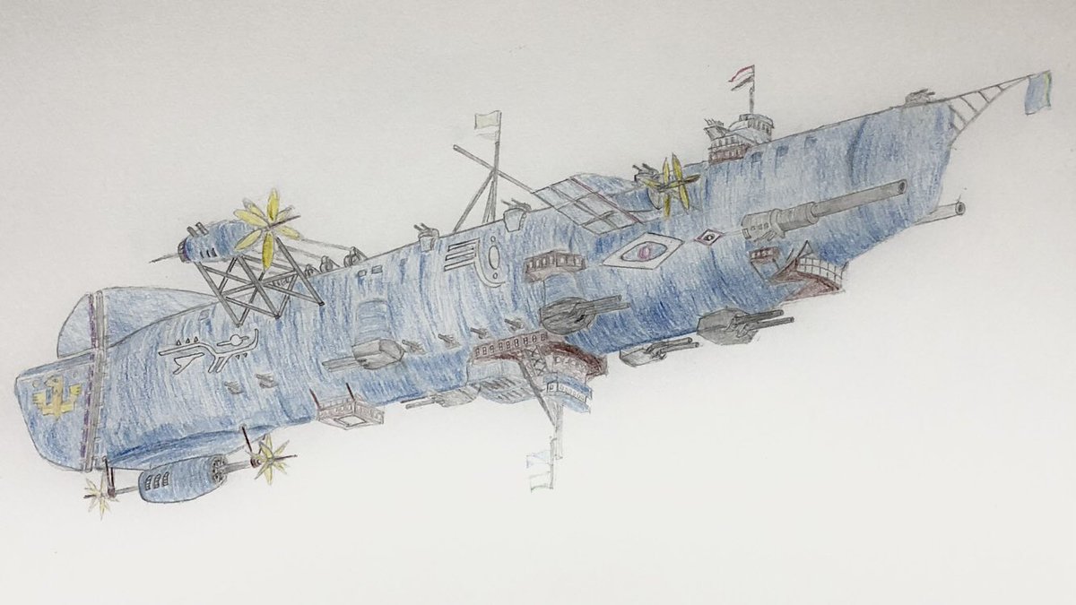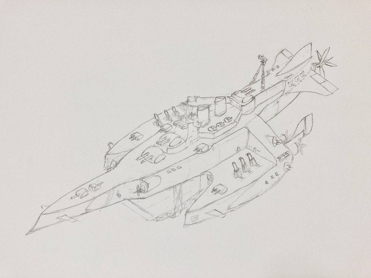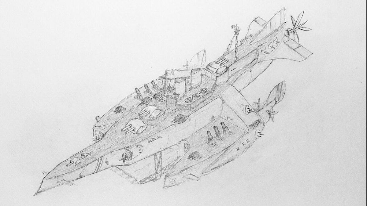 #今年もあと1ヶ月になりましたが画力がどうなったか見てみましょう 左 夏 戦艦ヒグラート (ラスティフロント作品) 右 冬 偵察巡空艦ターフィネイシュ (リプで作る架空艦作品) 画力よりも発想力が欲しいかな