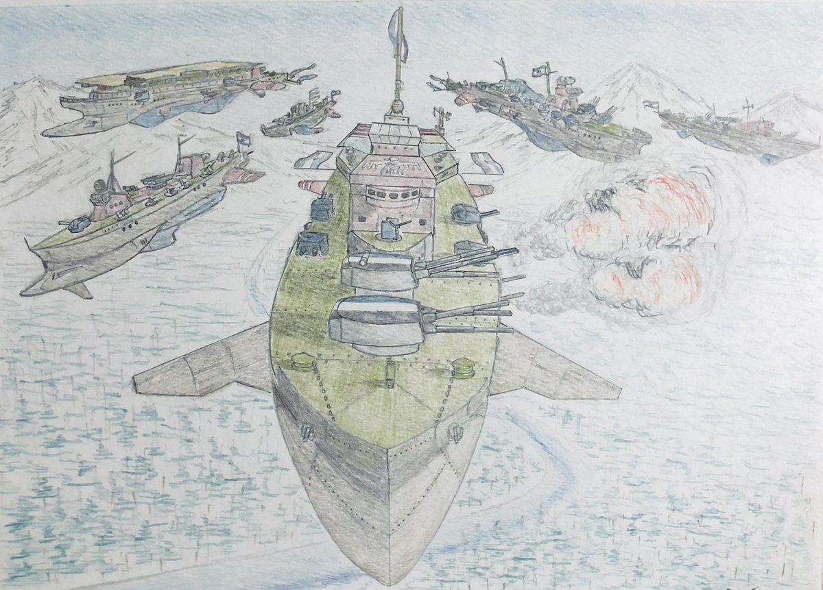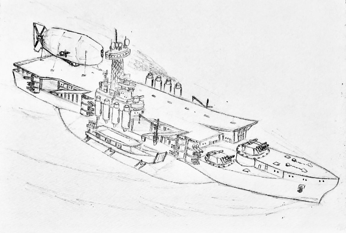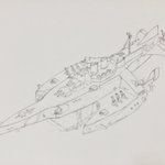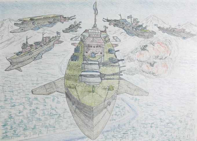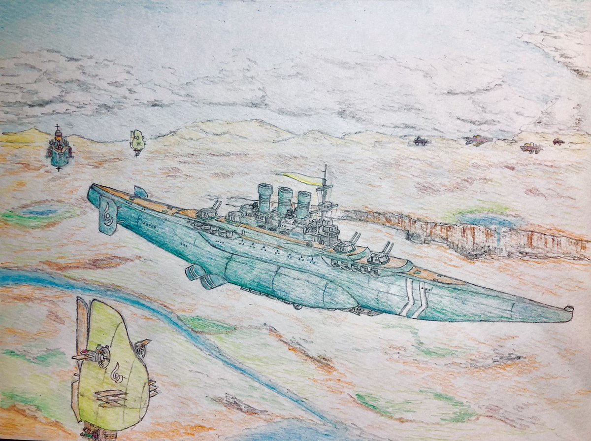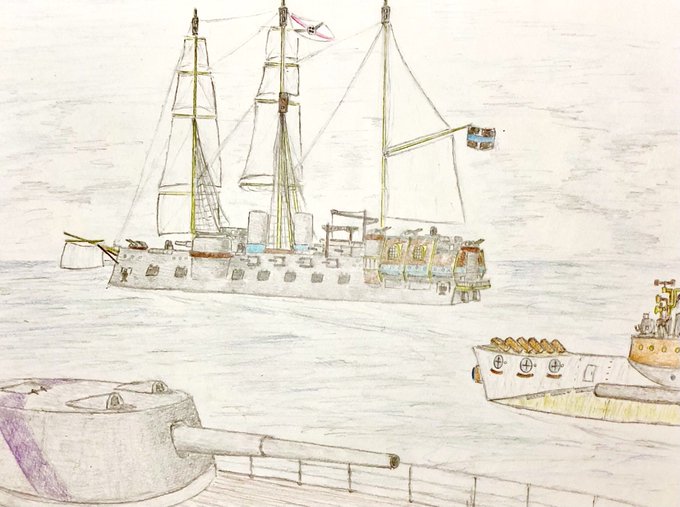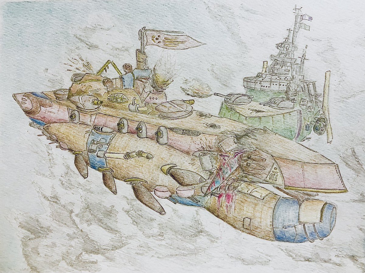 #今年もあと1ヶ月になりましたが画力がどうなったか見てみましょう 左 夏 戦艦ヒグラート (ラスティフロント作品) 右 冬 偵察巡空艦ターフィネイシュ (リプで作る架空艦作品) 画力よりも発想力が欲しいかな