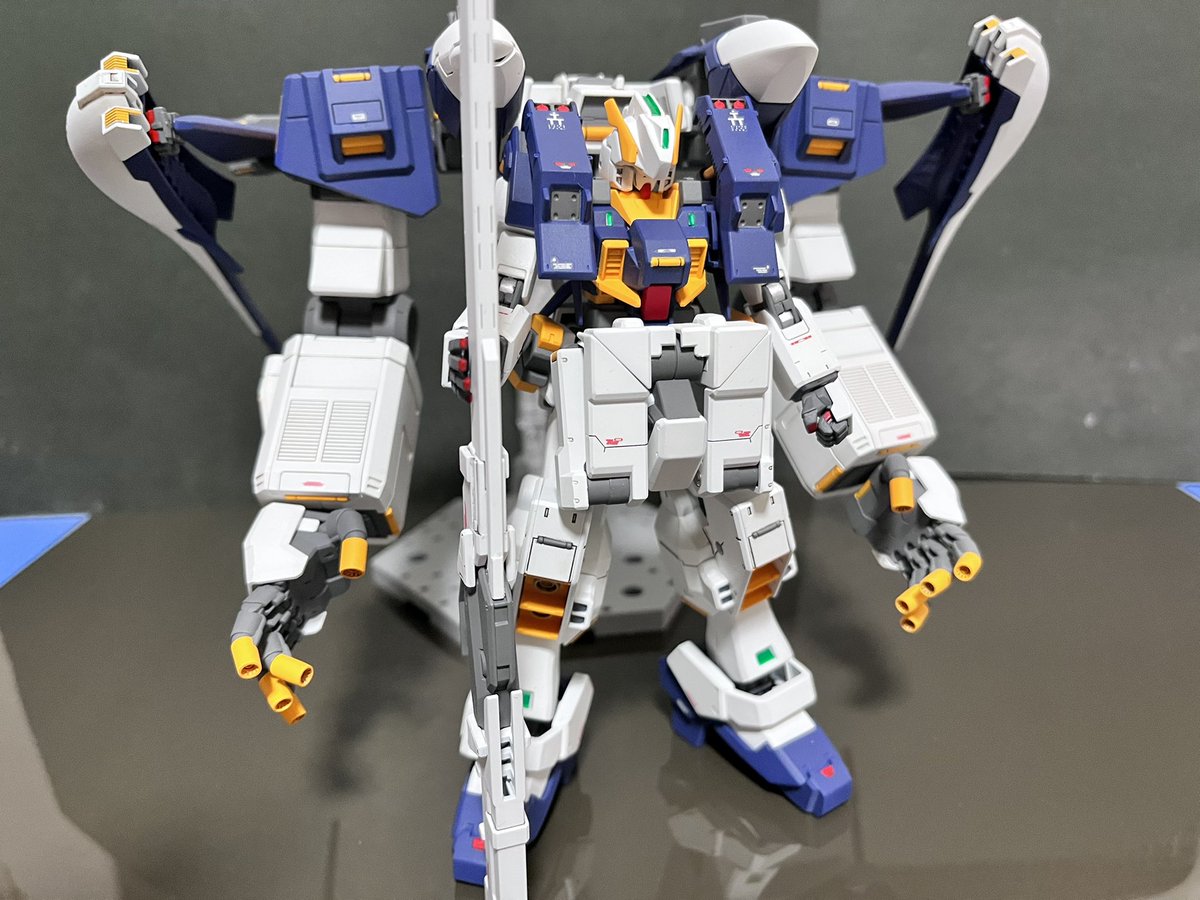 ハイゼンスレイII・ラーII形態 塗り分け頑張りました! ついに完成、、、!組み立て、塗装、マスキング、塗装、マスキング、塗装、メタルパーツ吹っ飛ばし探索、組み立てで100時間くらいかかったような気がする!ギガンテ発売でこの界隈も盛り上がってくる気するな #ガンプラ #ハイゼンスレイ