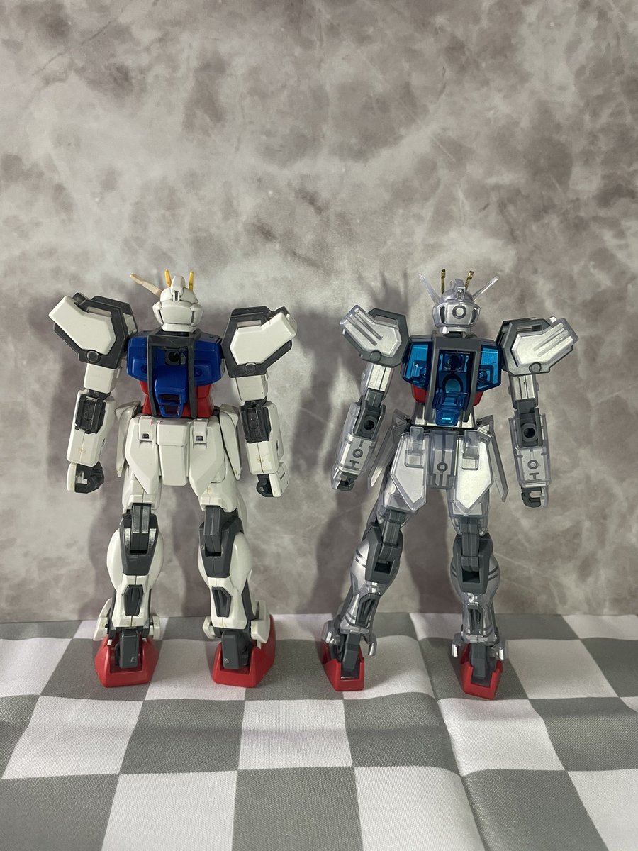 EGストライクガンダム完成しましたー😃 クリアパーツの裏にシルバー入れました✨ 20年物のストライクガンダムと並べてみた、EGはだいぶスマートになってる感😀 #EGストライクガンダム #ガンプラ #ガンプラ好きと繋がりたい