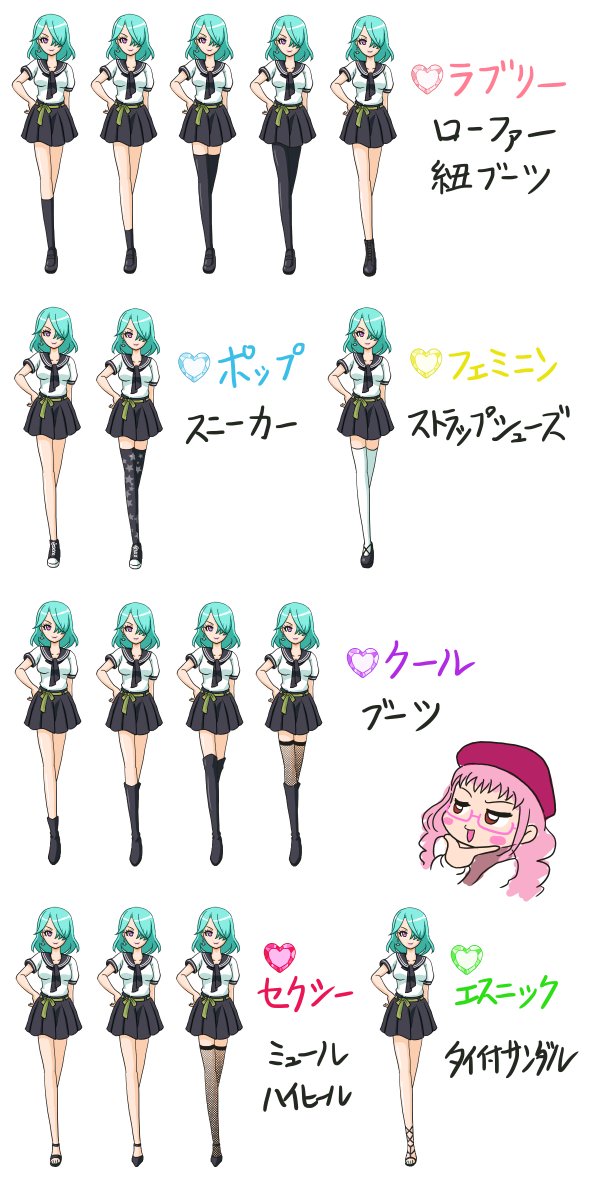 学生コスモさんの足元コーデわからな星人なので、 バリエーション描いてみる(カラーは白黒統一)
