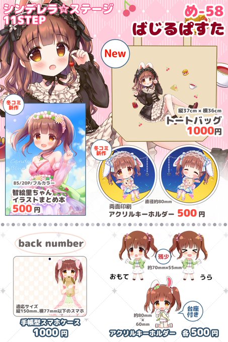 シンステ11のお品書きです 新作はノワール智絵里ちゃんのトートバッグです スペースは「め-58」です 後は「よー18 」「ぽりっしゅきゃろっと」様にて頒布される 望月聖ボイス決定記念合同誌「あなたの心へ、この歌を」に イラスト1枚寄稿していますのでそちらもよろしくお願いします #cin_stage