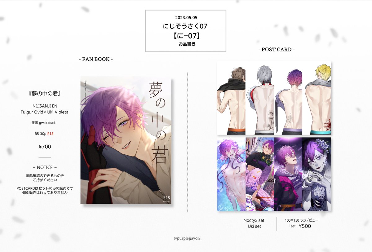 #にじそうさく07 「にー07」 サークル準備完了しました! どうぞよろしくお願いします🙇♂️❣️ 訪問前に下記のツイートを必ず参考にしてください! twitter.com/purplegayon_/s…