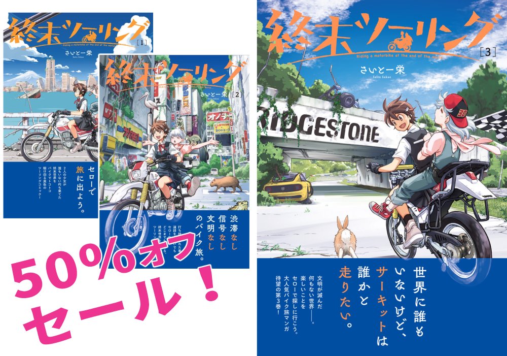 現在ゴールデンウィークのフェアで「終末ツーリング」1~3巻の電子版?が50%オフセール中💰だそうです。この機会にぜひ! kindle 1巻:amazon.co.jp/dp/B09283H6MN/ 2巻:amazon.co.jp/gp/product/B09… 3巻:amazon.co.jp/gp/product/B0B… 楽天 books.rakuten.co.jp/rk/277c0a8c3d5…
