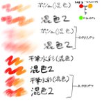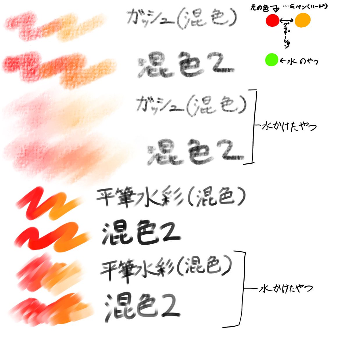 アイビスペイントで自分が普段使ってない筆で 色々グラデーション比較してみました ※文字汚いです 混色2の方が綺麗にグラデーションできる印象 上から水の筆掛けるとティッシュで擦ったみたいな感じに(๑・̑◡・̑๑) #アイビスペイント