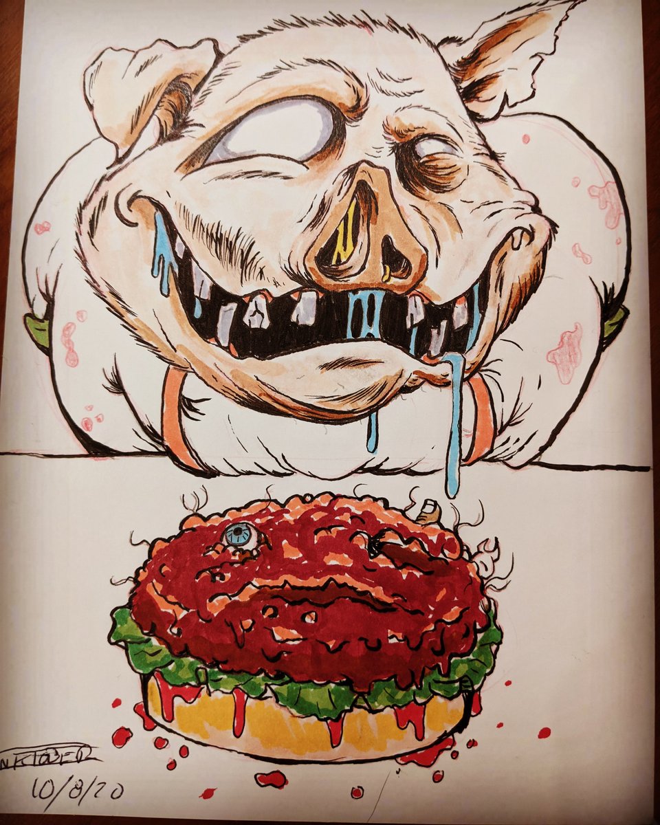 Keeping with the Courage villain theme. Was stoked for this one because it's one of the most twisted episodes where the butcher turns customers into the burgers they eat. #inktober #inktober2020 #couragethecowardlydog #jeanbon #burger #horror