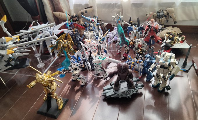 1 4 #ガンプラ 今飾ってある一軍の子達、お掃除用に1箇所に集合。 埃が…… 地震で倒れた時?の破損やらポロリが……今日中に終わるかな…… 22/10/30 11:52