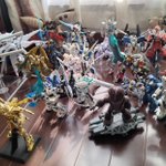 #ガンプラ 今飾ってある一軍の子達、お掃除用に1箇所に集合。 埃が…… 地震で倒れた時?の破損やらポロリが……今日中に終わるかな……