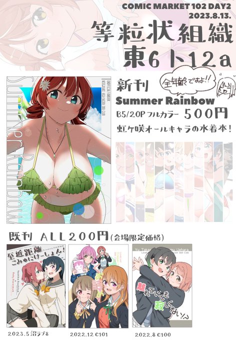 【夏コミ新刊告知】#C102 Summer Rainbow B5/20P/¥500 フルカラー 虹ヶ咲オールキャライラスト本です!全部水着🌞 メロンブックスさんにて予約開始しました↓ melonbooks.co.jp/detail/detail.…
