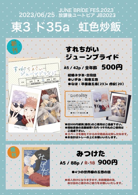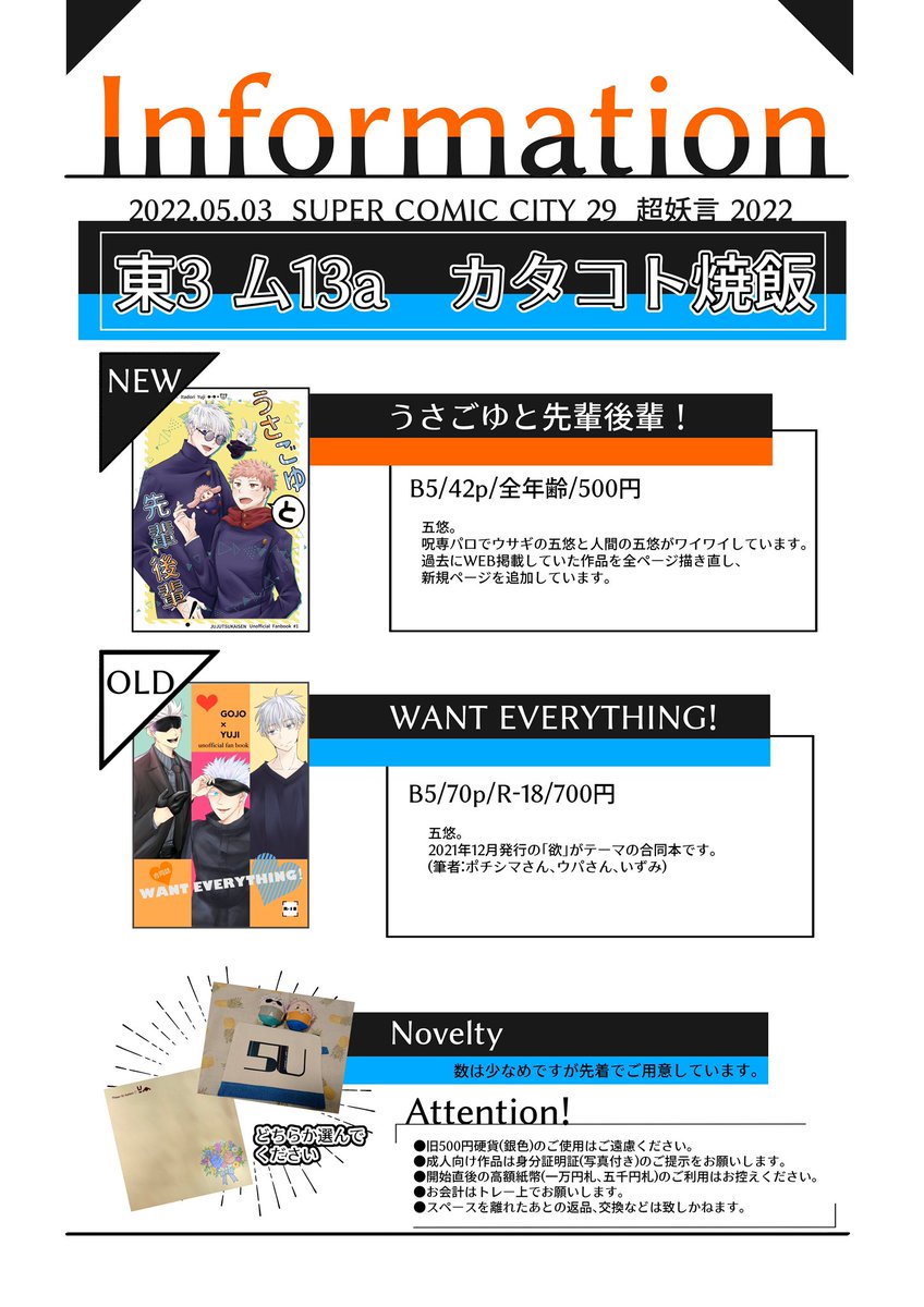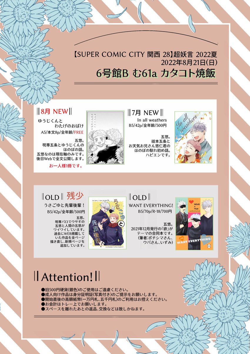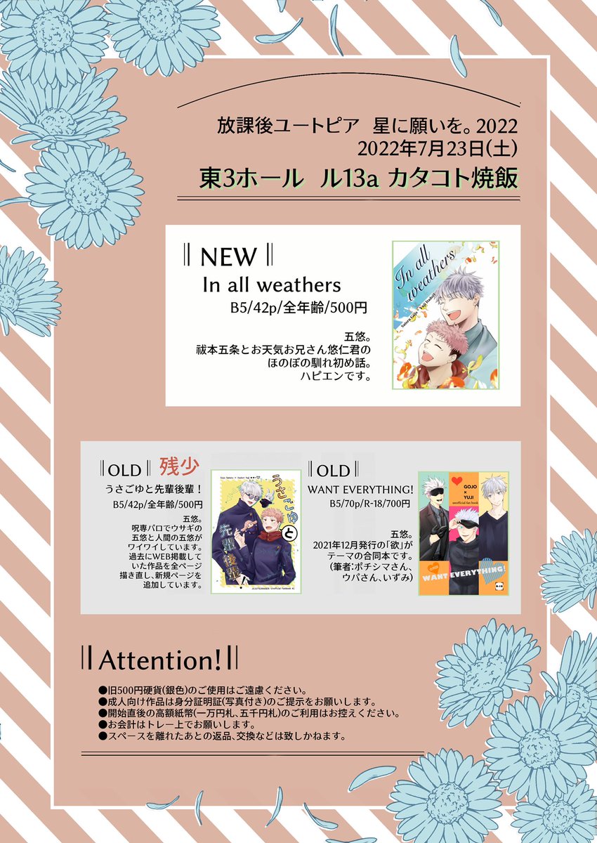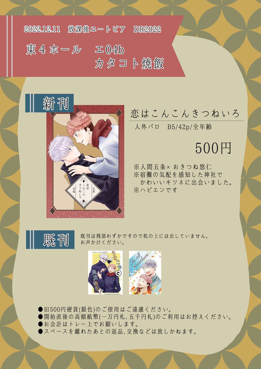 12/11 放課後ユートピアDR2022 お品書きです。 【東4ホール エ04b/カタコト焼飯】 おそらく五悠新刊あります…! サンプル▶︎ pixiv.net/artworks/10334…