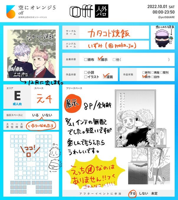 空🍊off参加させていただきます〜! パロは何も用意できませんでした…😇 8月の無配の展示のみになりますがよろしければ遊びに来てやってください! #空オレ_1001 #空オレ_1001_展示