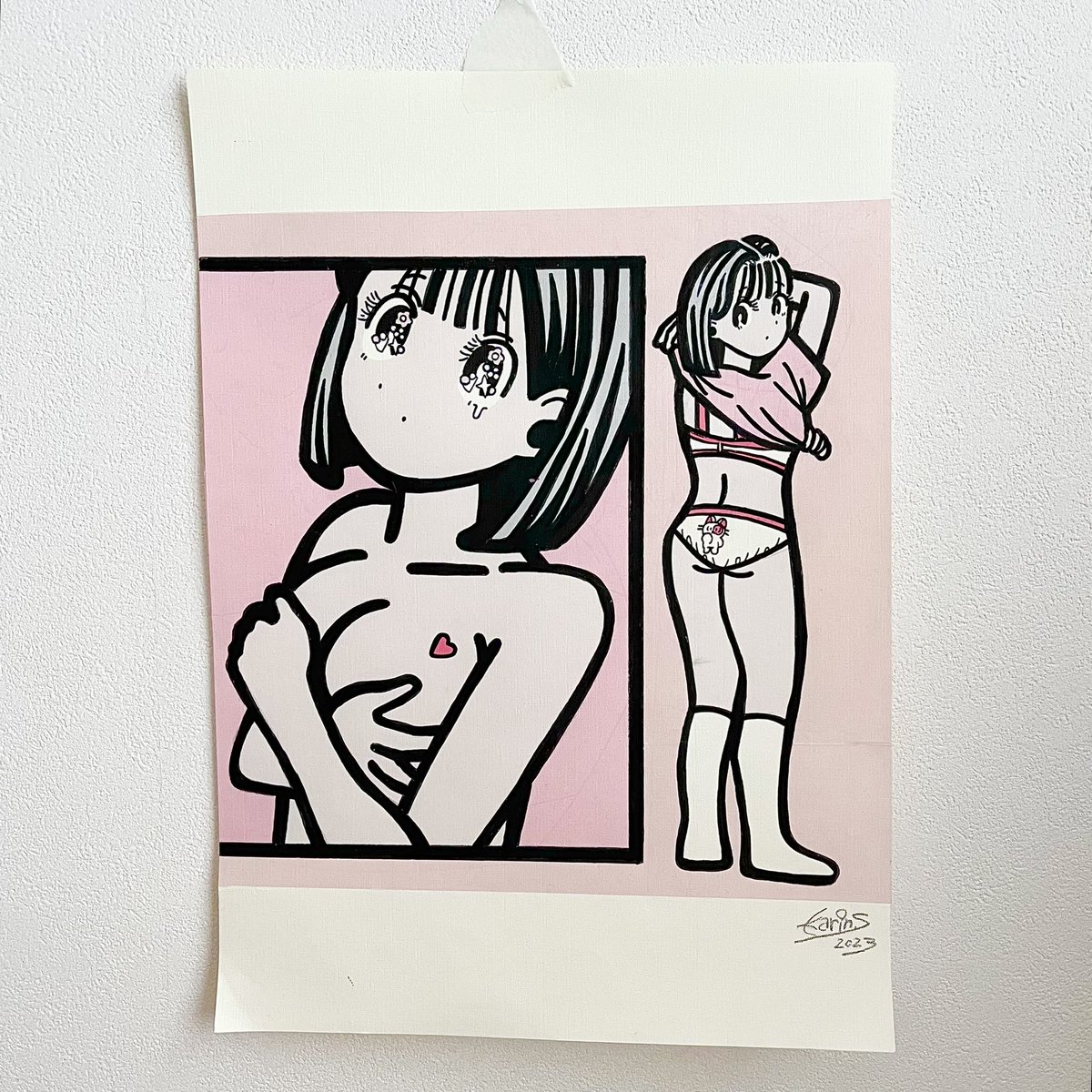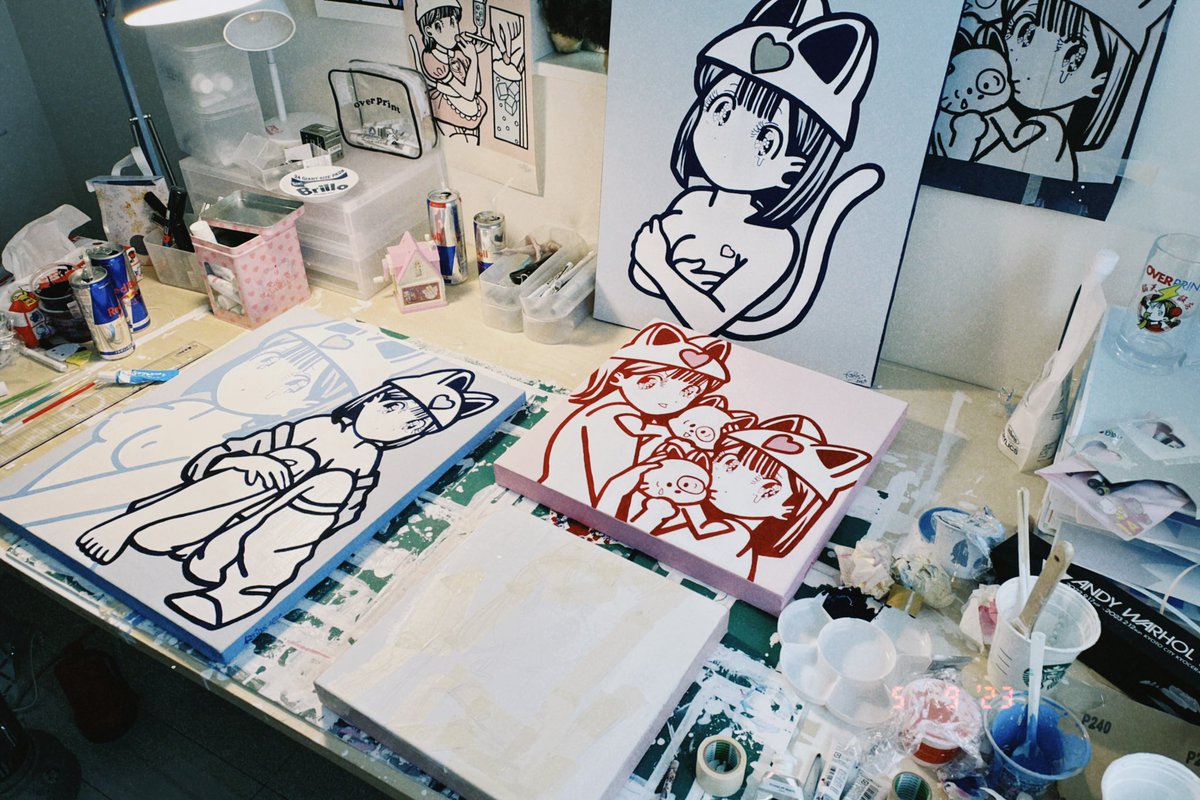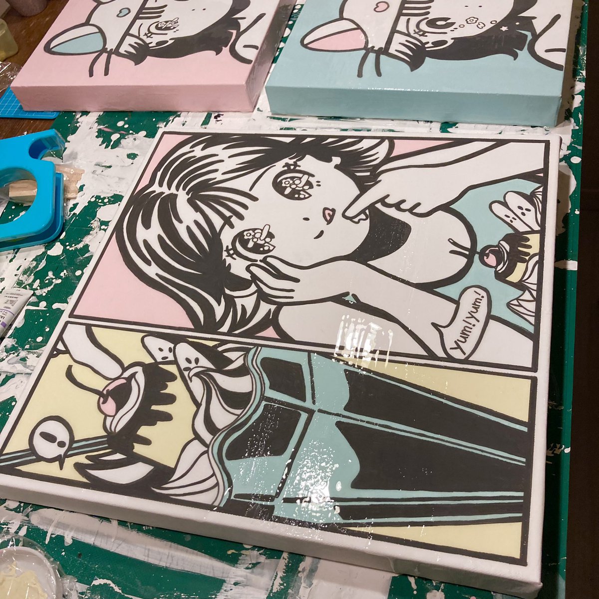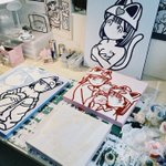 展示に参加させて頂きます!5月7日〜14日品川で開催。こちらまだ作業中の写真。アクリル絵の具でポップに3点描きました!よろしくお願い致します🌷🐱 twitter.com/tricerainc/sta…