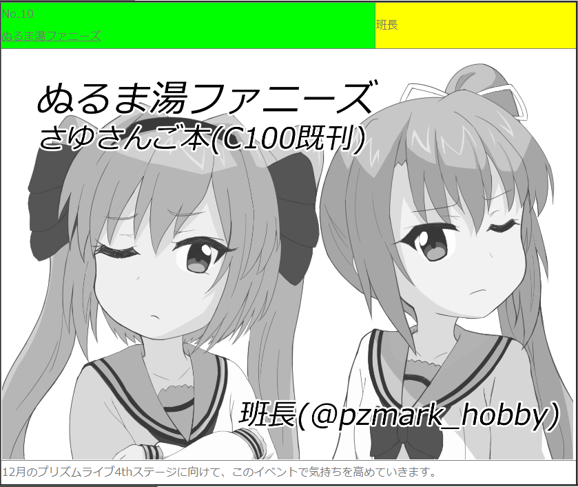 30 48 10/29の東京文具共和会館で開催のRe:ステージ!オンリー同人誌即売会"いまここがStart Line -Stage.3-" No.10に配置されました。 以前のリステオンリー2とC100のまとめ本予定です。 よろしくお願いします。 22/10/19 21:32