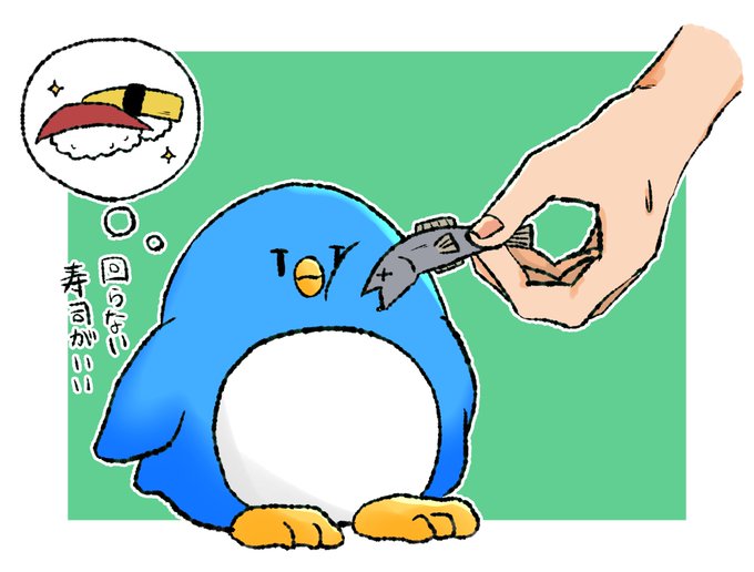 🐧「回らない寿司がいい」 サバを食べたがらないペンギン達が可愛かったので… #たけぉぇかき