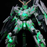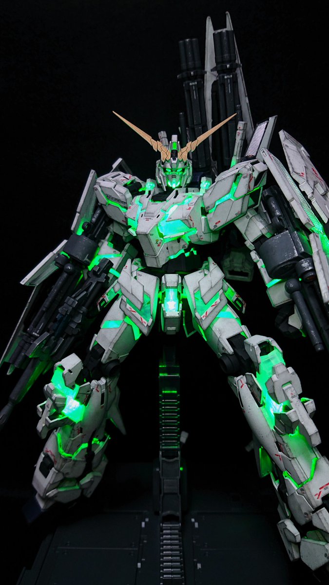 #上半期作ったプラモ晒そうぜ こちらの3体です。覚醒状態のユニコーンの写真を選んだら、たまたま色味が良い感じに分かれました。 #ガンプラ #トーリスリッター #ユニコーンガンダム #テスタメントガンダム #電飾