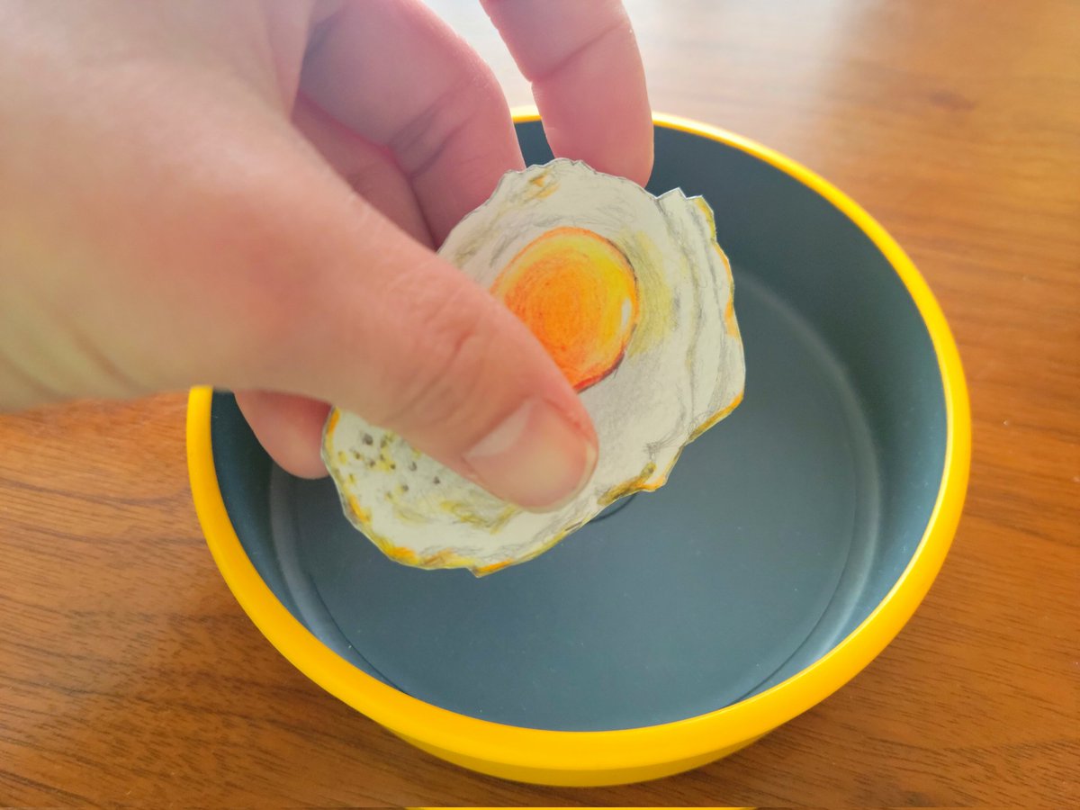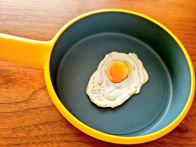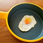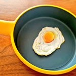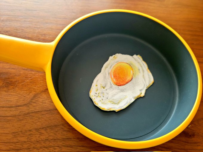 子どものおままごと用フライパンにそっと入れておくと、発見後即座に半泣き状態で床に叩きつけられた目玉焼き画 #色鉛筆画