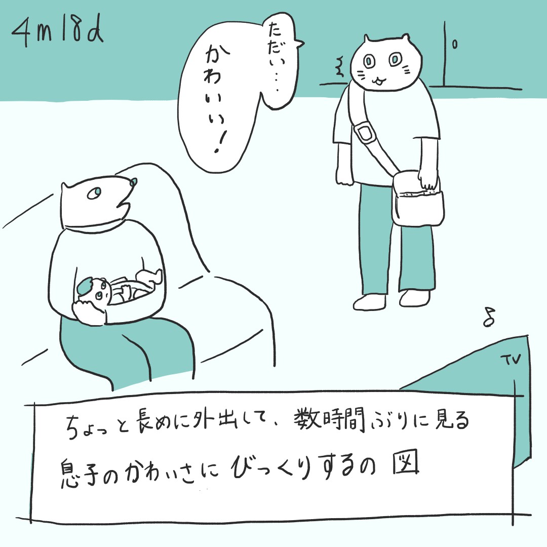 4m18d「ちょっと長めに外出して、数時間ぶりに見る息子のかわいさにびっくりするの図」 ずっといっしょにいると、「もー嫌だ」となることもあるけど、ちょっと離れてみるとかわいさを再確認します。 #育児絵日記 #育児漫画
