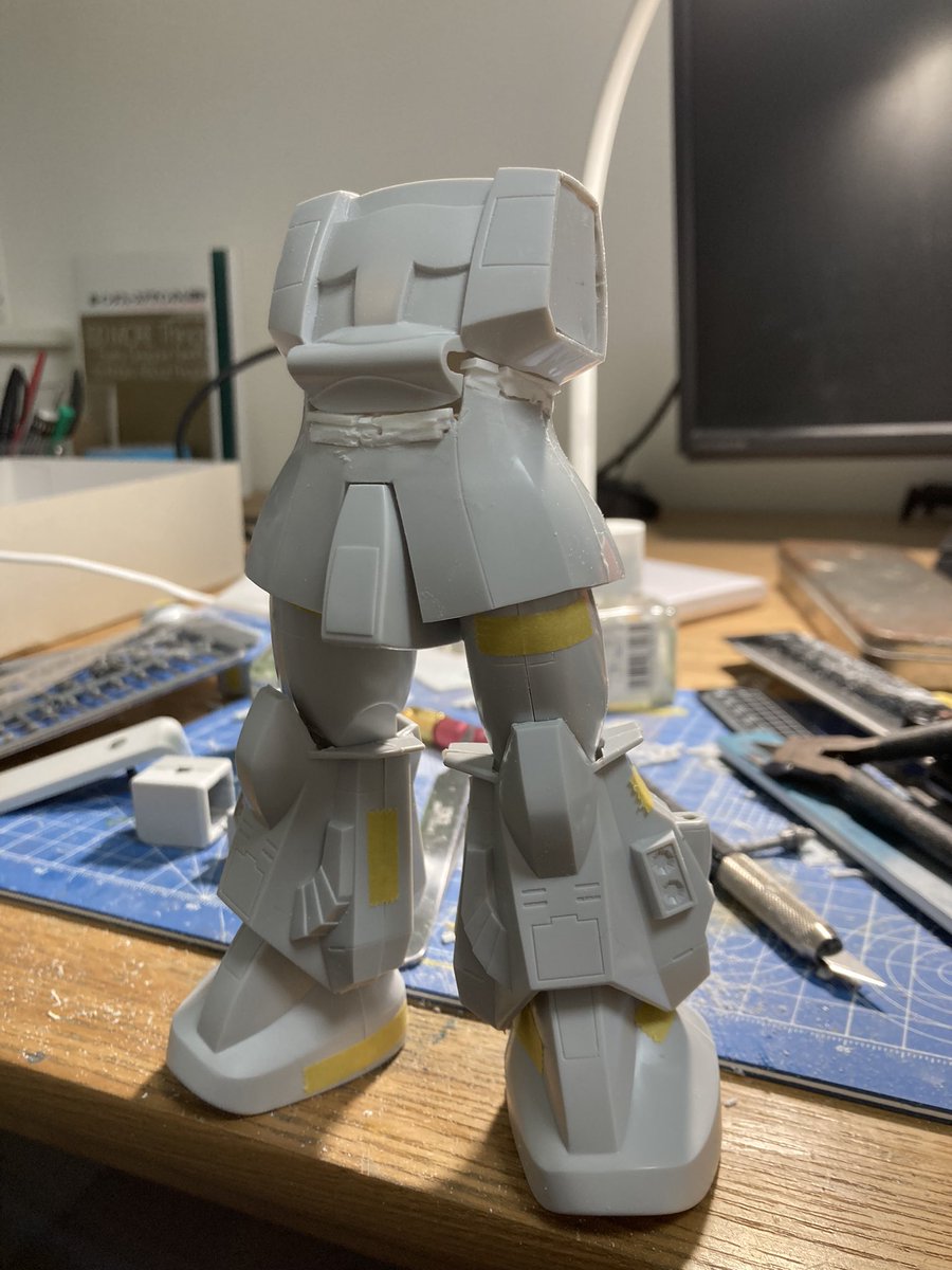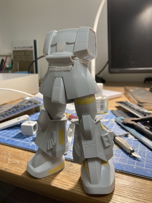 4 52 #ガンプラ #旧キット 1/100 06R 四肢のバランスを早く固めたくて、腕と脚をパテで固定。硬化後、軸を打つ。めーっちゃ、かっこいい!今回は、スジボリ中心に少しディテールを追加してみようかと画策中。 23/03/15 23:19