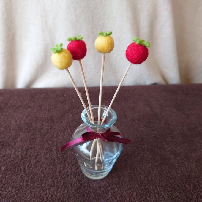 【ミニトマトアロマリードスティック/アロマディフューザー】 🍅瓶に入れてインテリアに 🍅 香りを楽しむアイテム minne.com/items/30250457 オプションで精油1ml(エッセンシャルオイル)選べます🌿 #minne #minne_new #アロマ #羊毛フェルト