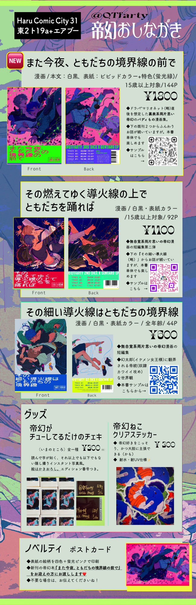 【サークル参加します!!】03月19日(東京)HARU COMIC CITY 31内 CrazyLyricBattle 27| #イベントGO_赤ブー akaboo.jp/event/item/201… サークル:@QTfarty 場所:東2ト19a 【お品書き】 帝幻新刊とぽっせの既刊,ステッカーやチェキなど❤︎ Pixiv版→pixiv.net/artworks/10633… twitter.com/qtfarty/status…