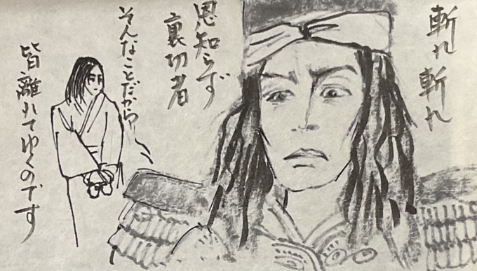 家臣の裏切りに心閉ざす家康。 されど老臣は直言する。 信じるか、もしくは疑わしきをことごとく滅せよ、と。 疑わしければ殺した男の大河を一年前に見ていたと思い出し、感無量でございました。 #どうする家康 #どうする絵 正信が家康公を、たらふく食べて妻子の為に戦さ、と批判したのは深み有り。