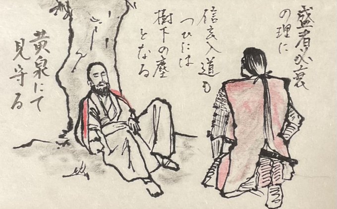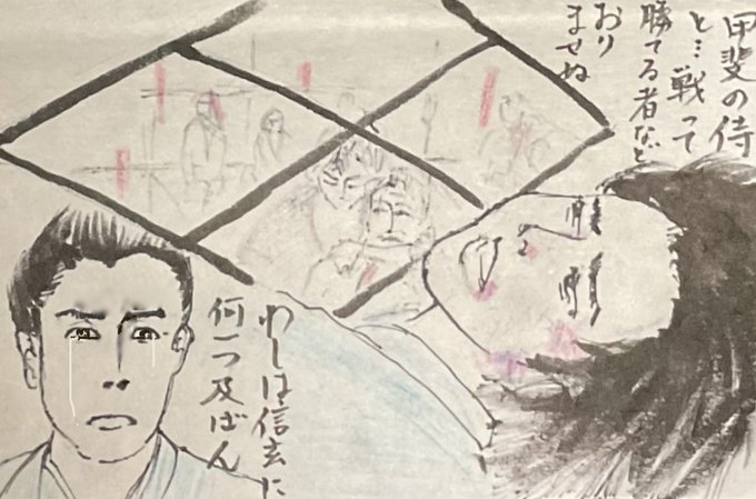 進軍の途上で斃る信玄公。 遺言なれど喪を秘すは難しく、訃報は素早く各地に飛ぶ。 #どうする家康 #どうする絵 樹下の髑髏が写りましたが、信玄公は諏訪湖に沈められたとの言い伝えを今作では採らず、敢えて、死を隠すための非情なご遺骸打ち捨て描写でございましたか。 刀一振りを黄泉路の供に。
