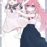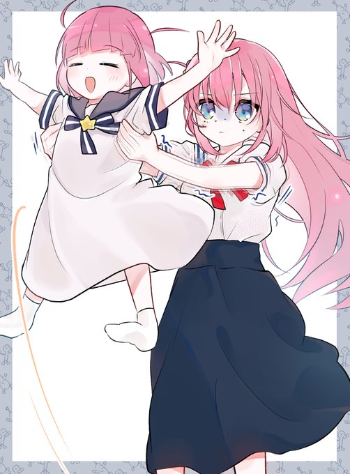 高い高いで喜ぶふたりちゃんと今にも腕が死にそうなぼっちちゃんのセーラー服姉妹