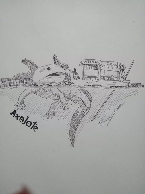 Dia 19, Axolote, visitando a su amigo que creció un poco. @LeyendasPodcast #TintubreLegendario2022 #leyendaslegendarias #axolotl #ajolote #Inktober #dibujo