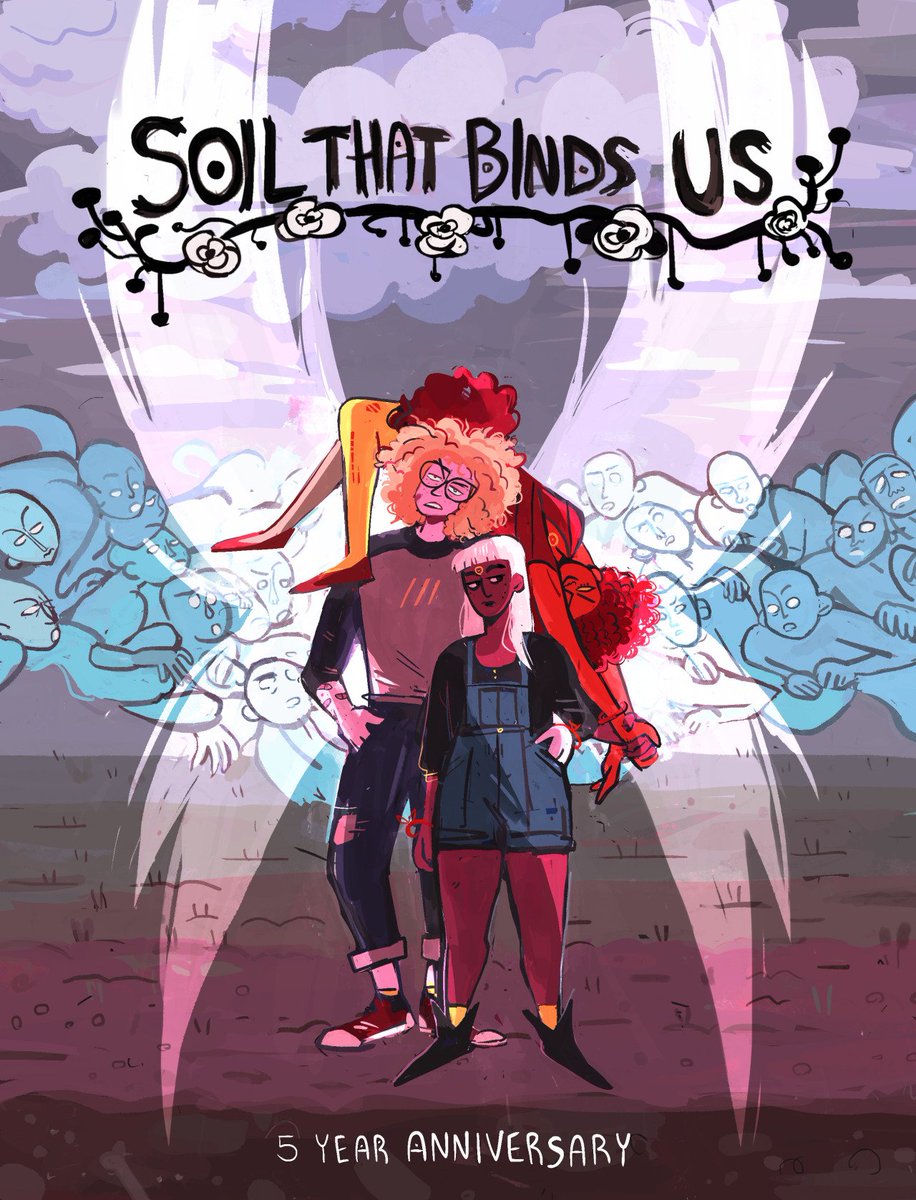 made a simple little cover for the 5 YEAR ANNIVERSARY of my ONGOING ADVENTURE WEBCOMIC ABOUT GHOSTS AND PEOPLE WHO TALK TO THEM, SOIL THAT BINDS US!!! soilthatbindsus.com/pages/title-pa…