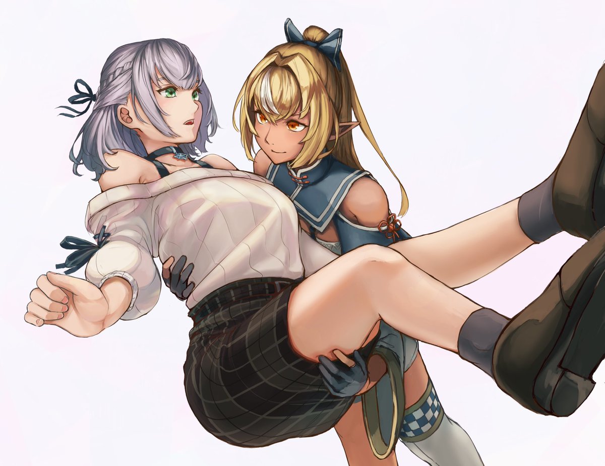 #白銀ノエル新衣装 #不知火フレア新衣装 #ノエラート #しらぬえ 一足先にバーチャル都会へ繰り出し、JDに扮した団長が、フレアに現代風の服を着せるの図