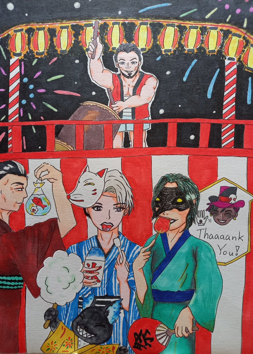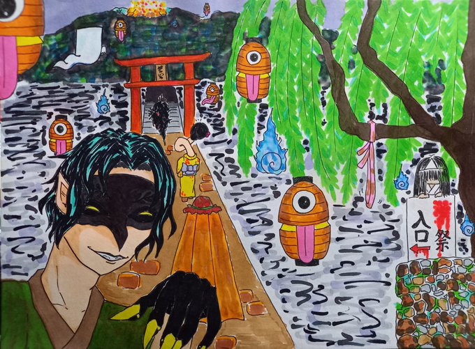 #twst_夏休み企画 #twstファンアート まんじゅう様の素敵な企画に参加させていただきました。学園長と夏祭りです。 学園長「おや。何をしているのです?ほら、こちらです。早く行きましょう」 生徒「…学園長。本当にこれ人間が参加していい祭なんですよね!?((( ;゚Д゚)))」