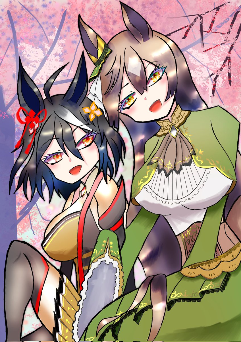 キタサトコンビ描けた(о´∀`о) 多分桜の方が時間かかったと思う笑 服なしはダメなので描いてません #イラスト #絵 #キタサンブラック #サトノダイヤモンド #キタサト #ウマ娘