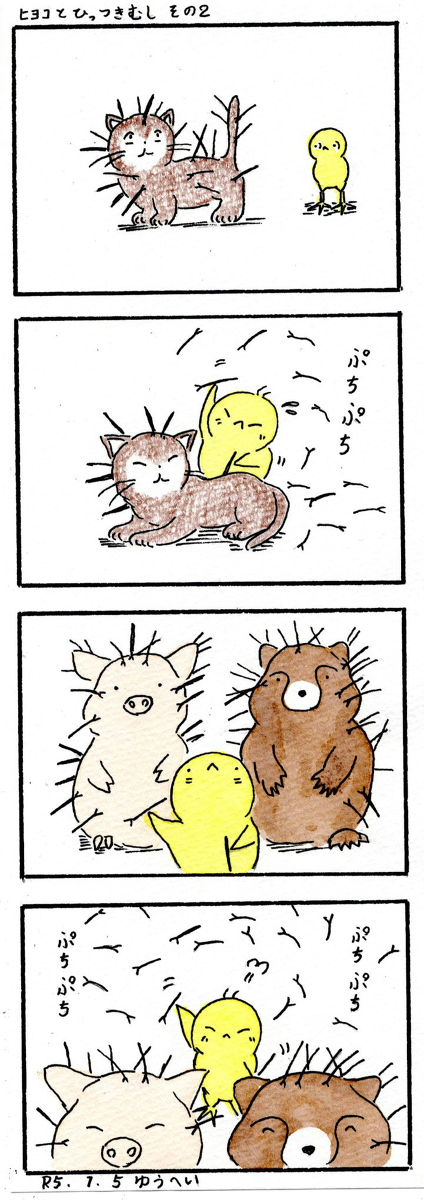1 5 ヒヨコとひっつきむし その2 #4コマ漫画 #オリジナル #手描き #ヒヨコ #ネコ #ブタ #クマ #ひっつきむし pixiv.net/artworks/10430… 23/01/07 10:55