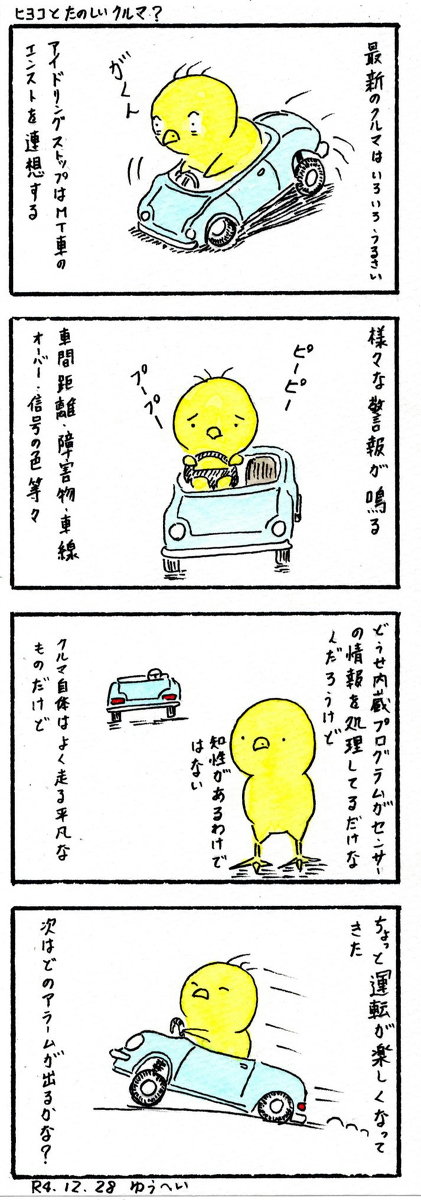 1 4 ヒヨコとたのしいクルマ? #4コマ漫画 #オリジナル #手描き #ヒヨコ #クルマ #運転アシスト #運転する楽しみ pixiv.net/artworks/10404… 22/12/30 11:59