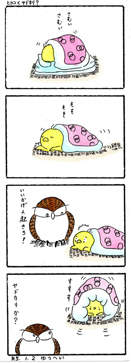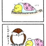 ヒヨコとヤドカリ? #4コマ漫画 #オリジナル #手描き #ヒヨコ #フクロウ #布団から出られない pixiv.net/artworks/10422…