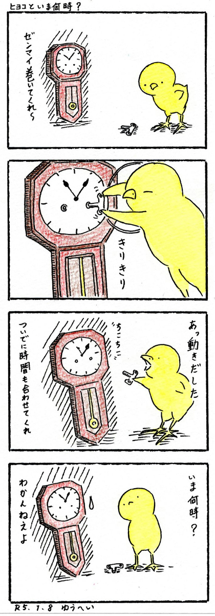 ヒヨコといま何時? #4コマ漫画 #オリジナル #手描き #ヒヨコ #ゼンマイ時計 pixiv.net/artworks/10442…