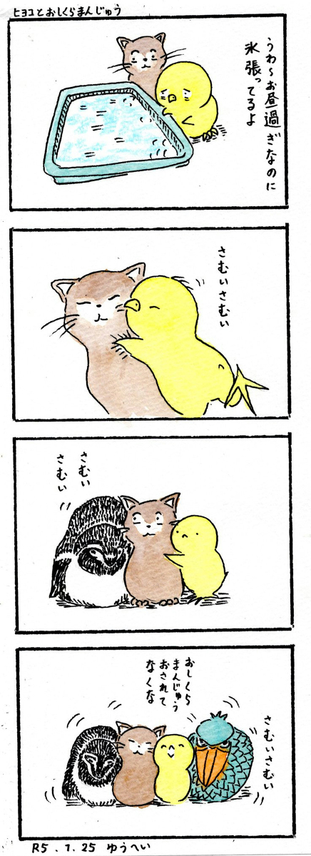 1 6 ヒヨコとおしくらまんじゅう #4コマ漫画 #オリジナル #手描き #ヒヨコ #ネコ #ペンギン #ハシビロコウ #おしくらまんじゅう pixiv.net/artworks/10484… 23/01/27 07:02