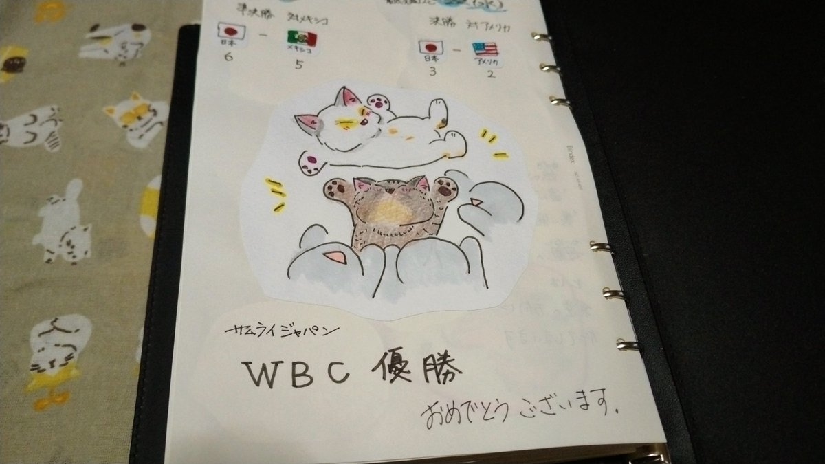 こんばんは。3/20~今日3/22までの #絵日記 描きました。 #侍ジャパン WBC 優勝おめでとうございます。👏👏👏🎉🏆️ #イラスト #猫 #猫の居る暮らし #猫あるある