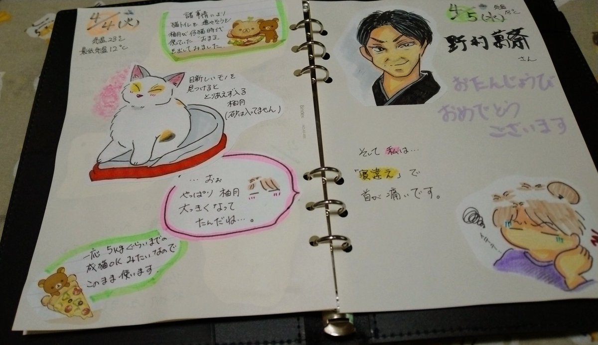 1 67 おはようございます。4/4と4/5の #絵日記 です。 1日遅れになりましたが #野村萬斎 さん。お誕生日おめでとうございます🎉 そして私はまだ首が痛いです😅 #イラスト #アナログイラスト #猫 #猫の居る暮らし 23/04/06 09:48