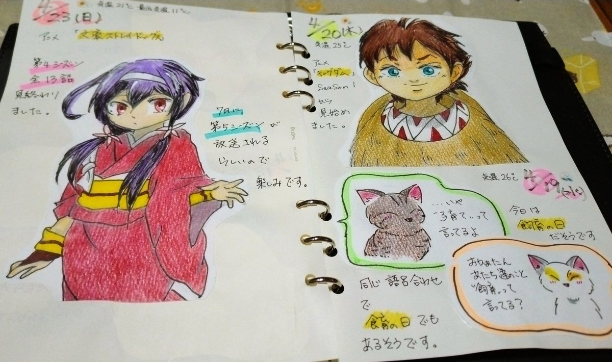 こんばんは。4/19~4/20と今日4/23の #絵日記 描きました。 #イラスト #アニメ #文豪ストレイドッグス泉鏡花描いてみた #キングダム河了貂描いてみた