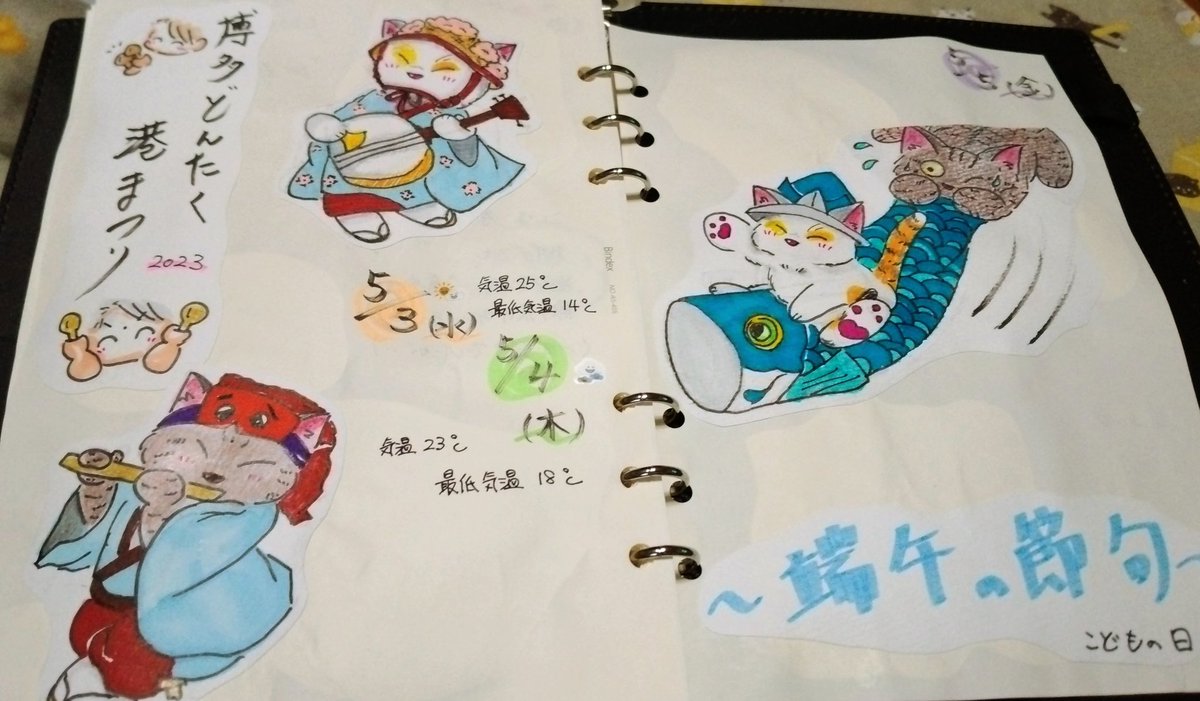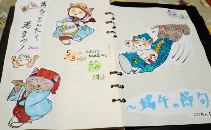こんばんは。 今日は未来日記を描いていました。😆❗ 「博多どんたく港まつり」と「こどもの日🎏」の #イラスト です。 後日5/1と5/2分の #絵日記 を描き上げ次第一緒に絵日記として投稿いたします。😊❤️ #猫