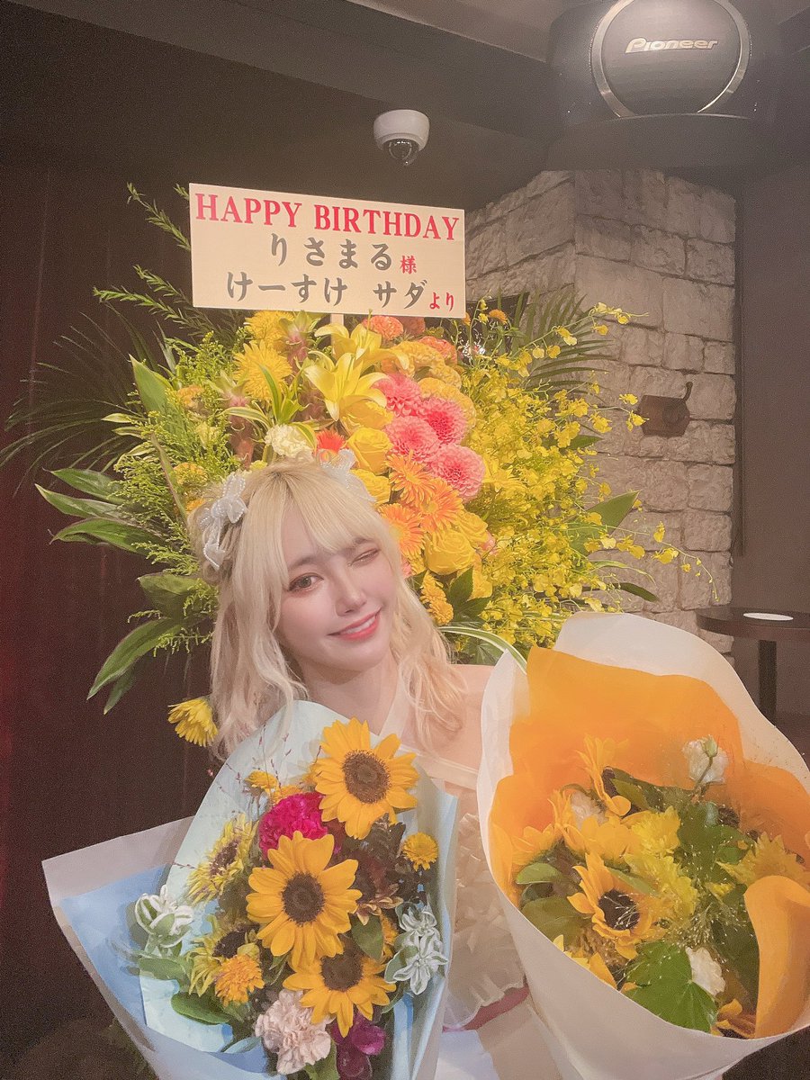 ギャルカフェからの花束嬉しすぎて顔突っ込んだ写真 かわゆいギャルたちとの写真 花束に囲まれた写真 モンスターボールから覗き見する写真 どれも楽しそうで幸せだ ! #りさまる生誕祭2022