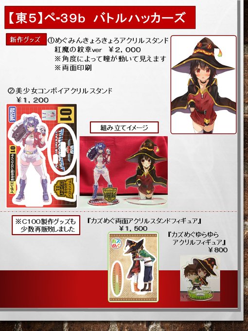 #C101 お品書き 1日目ぺ39b「バトルハッカーズ」 新作グッズ 1)めぐみんきょろきょろアクリルスタンド紅魔の紋章ver イラスト-鴨月ゆの @suke_yuno 先生 鴨月ゆの先生の描かれる綺麗な瞳が角度によって動く仕様。両面印刷 2)美少女コンボイアクリルスタンド イラスト-風川なぎ @masulao 先生 twitter.com/r_jetan/status…