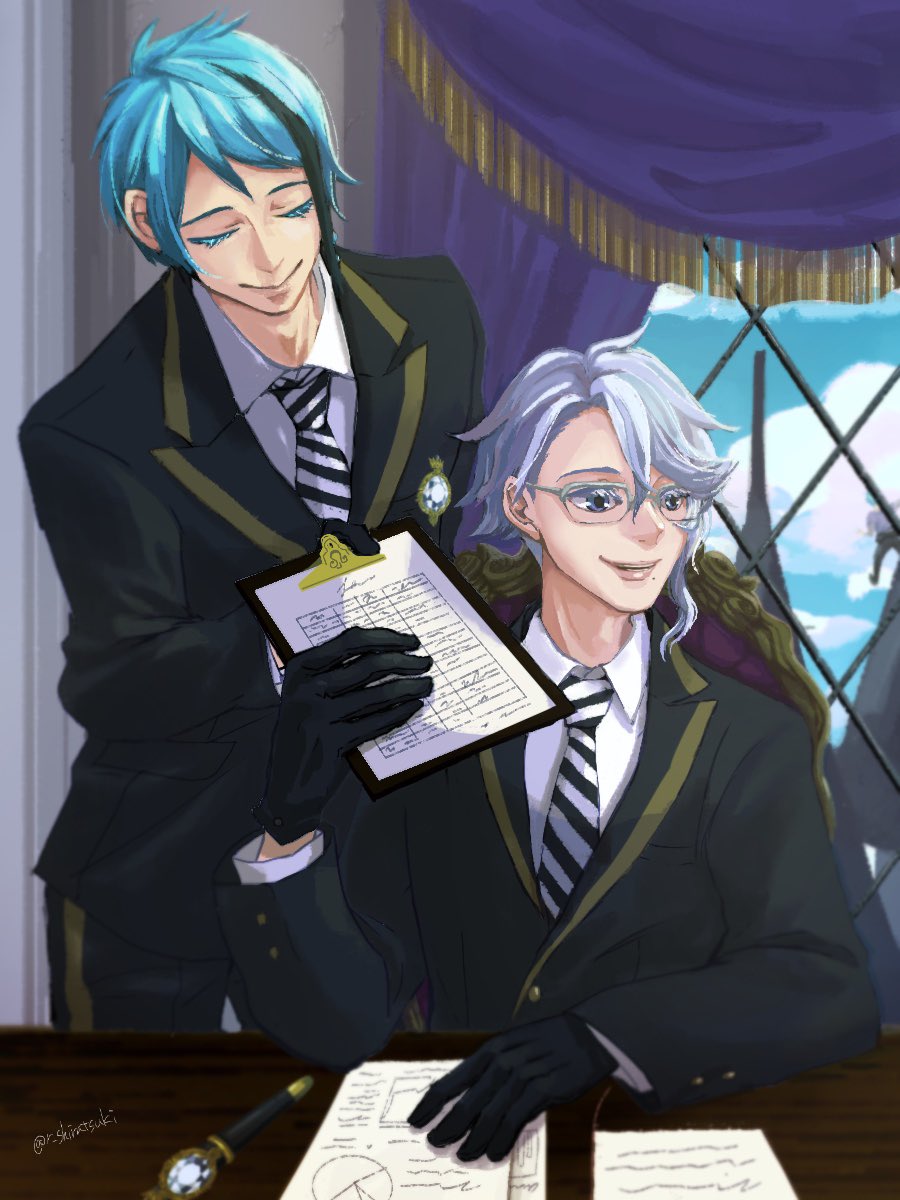 🐙「ああ、その件でしたら調査済みですよ。こちらに資料が」 ------ 寮長副寮長でノールック書類パスして欲しいーーーーー!!!!という妄想!!!!!!! #ツイステファンアート #twstファンアート
