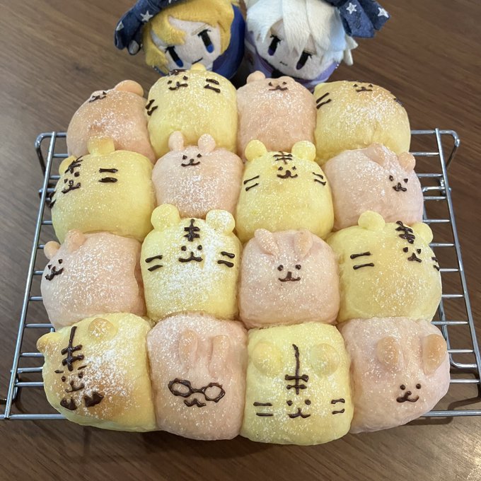「今日はタイガーさんの誕生日なので、トラとうさぎのふわふわちぎりパンです✨」 「ワイルド君!おめでとう、そしておめでとう!✨」 「こんがりした子はタイガーさん仕様になりましたね🐯」